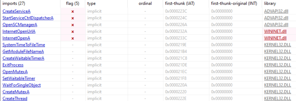 - This program calls an URL by using InternetOpenUrlA. It checks for one-time instance (so the program should run just once). CreateServiceA probably is a persistance mechanis, OpenSCManagerA is used to set services in general.
